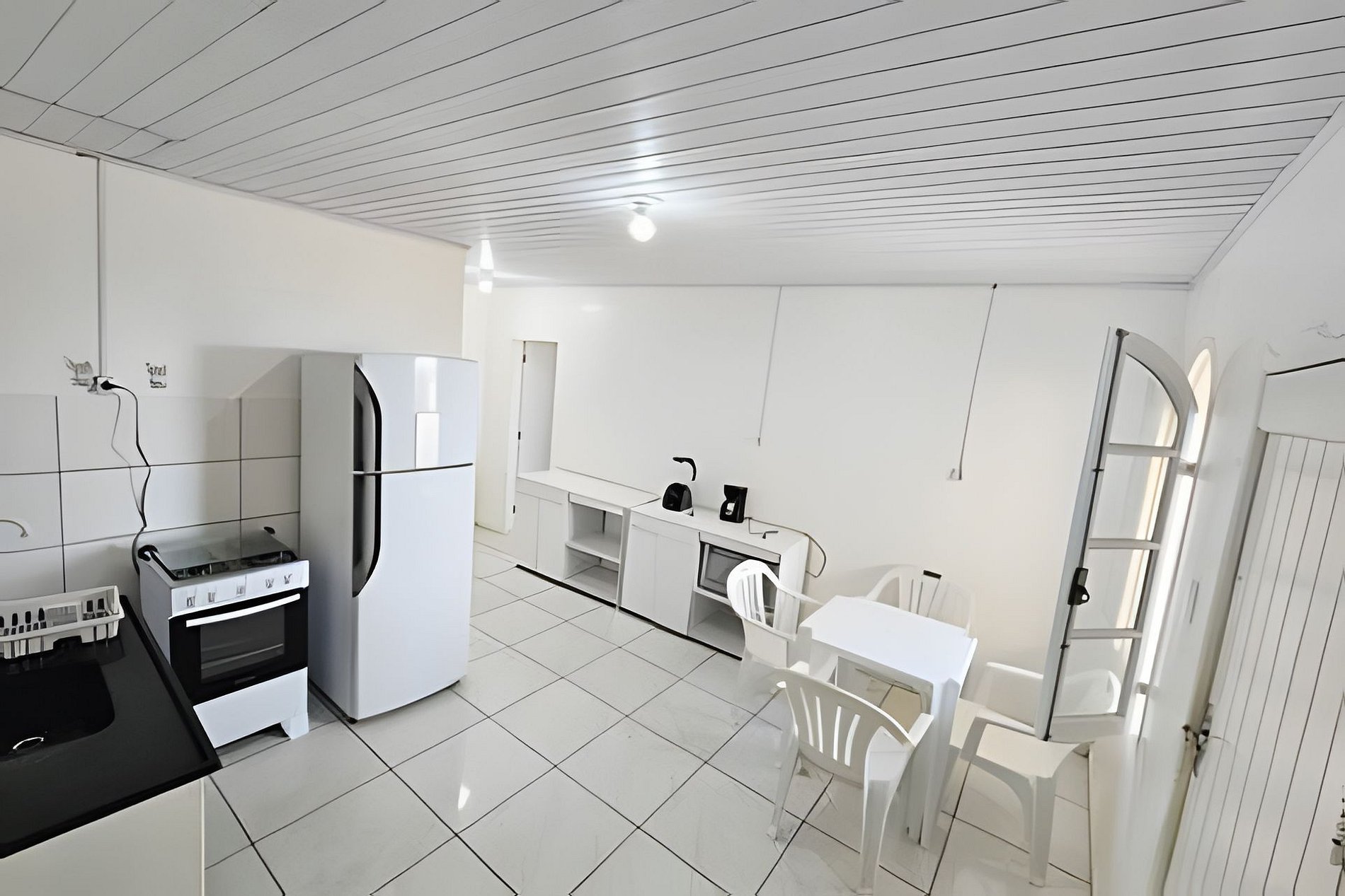 A cozinha é completa, equipada com fogão de 4 boca com forno, geladeira, micro-ondas, cafeteira, sanduicheira, liquidificador, panelas, louças, talheres e utensílios. Também disponibilizamos uma churrasqueira portátil para uso no pátio, que oferece vista para o mar e contato com a natureza.